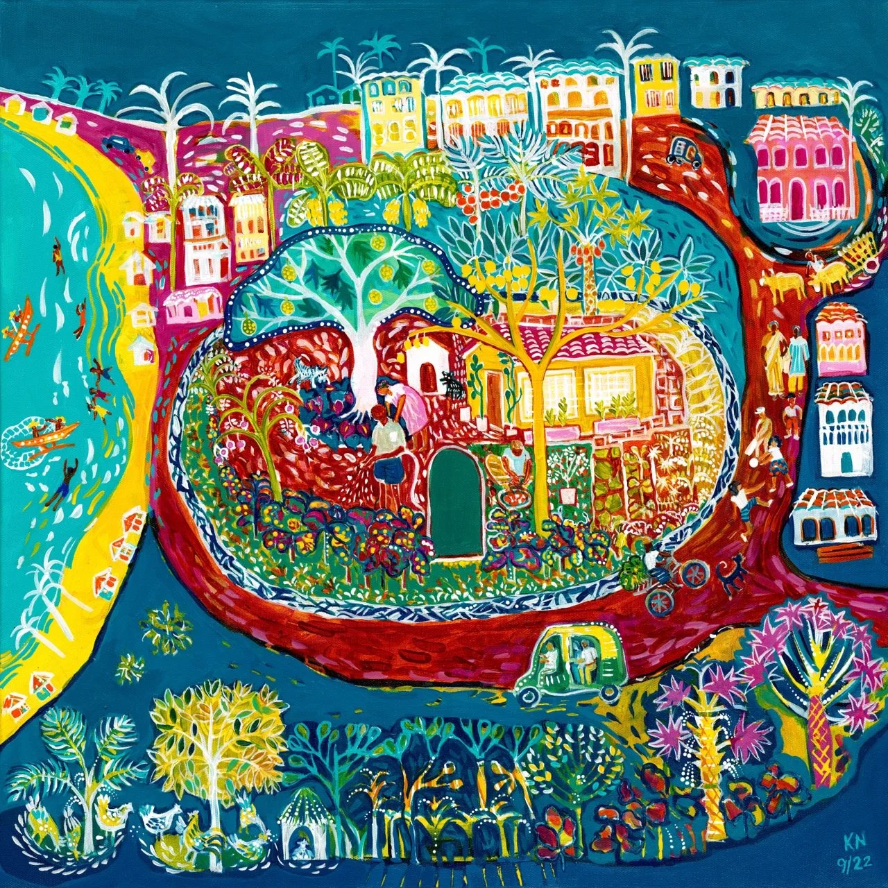 Kanj Nicholas is a Midlands-based multi-disciplinary visual artist, illustrator, author, and arts educator. Her vibrant work, influenced by her Sri Lankan heritage and Australian textile training, spans varied mediums and explores the natural world, community interactions, and storytelling.