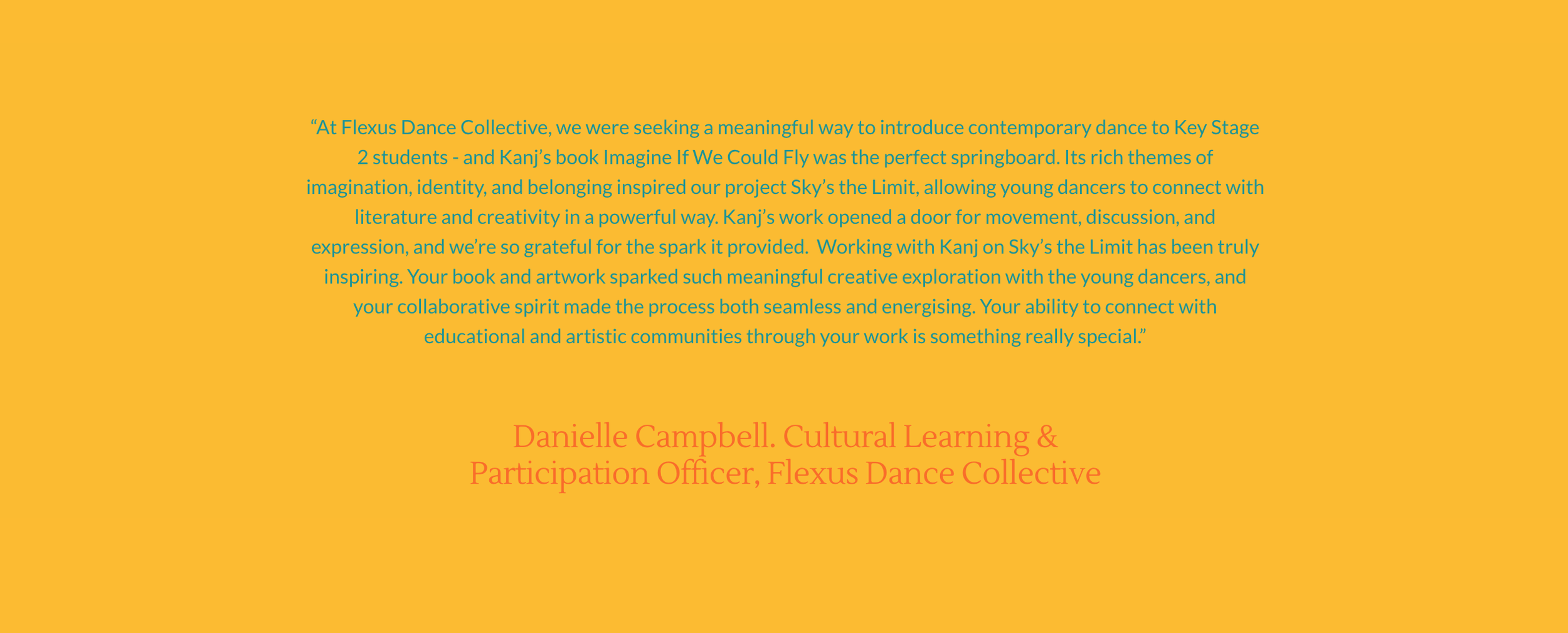 As an experienced Arts Educator, Kanj delivers creative workshops to diverse audiences, working with community groups and organisations to inspire creativity and expression in both children and adults. Her passion for fostering imagination extends to her role as an author and illustrator. In 2024, she published Imagine If We Could Fly, a children’s book supported by Arts Council England. The book is a vibrant celebration of curiosity, encouraging young readers to think beyond boundaries, colour outside the lines, and embrace creativity fearlessly.