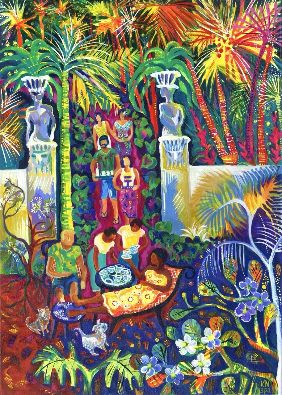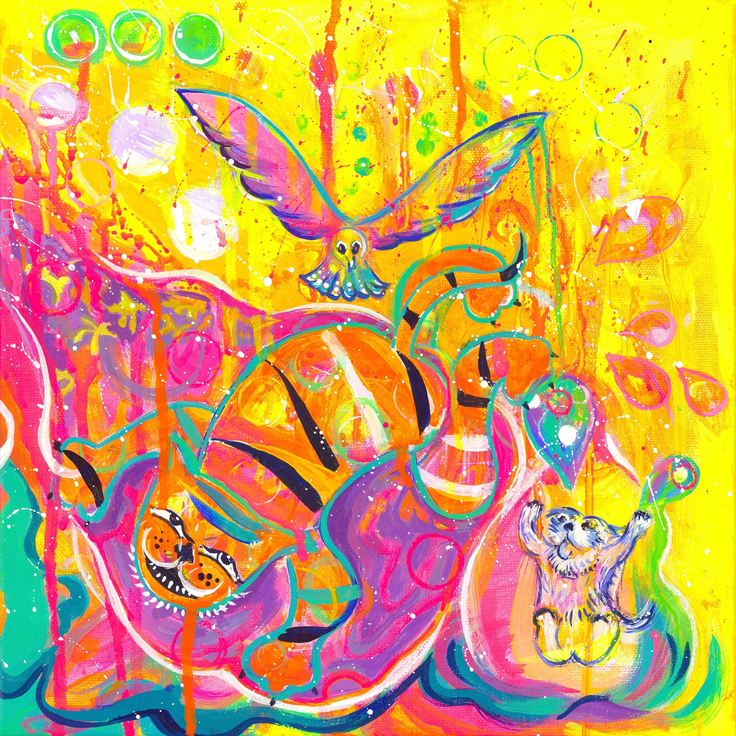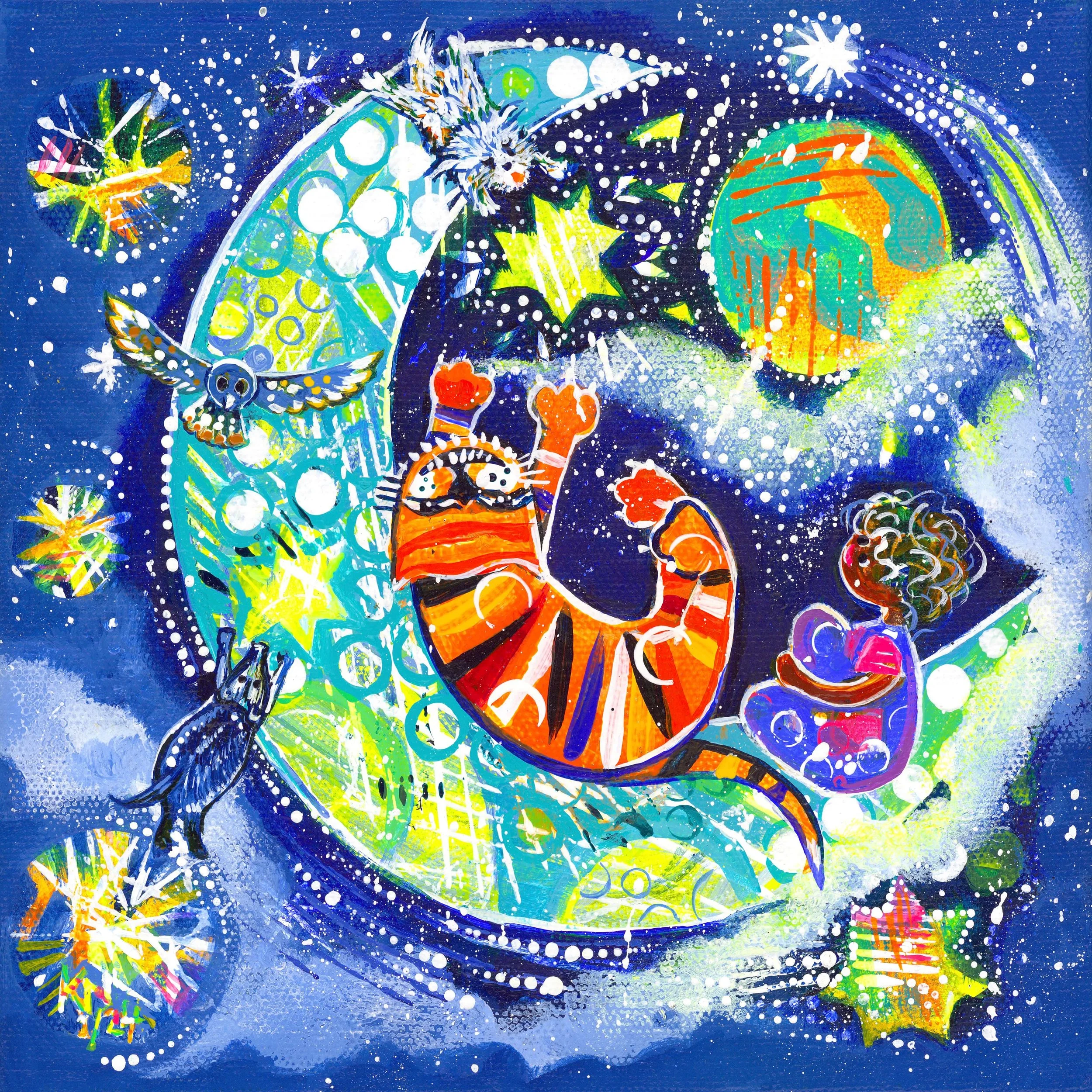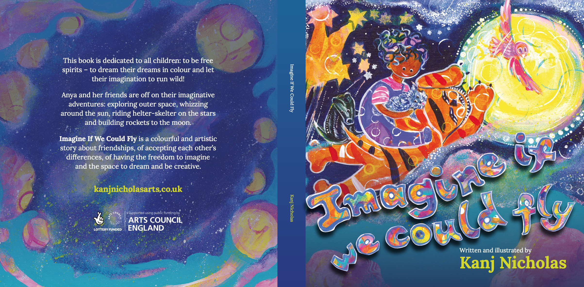 Kanj works in acrylics, slowly building layers with vibrant colours, pattern and mark-making, to create her exuberant and unique illustrations. Her children’s book, ‘Imagine If We Could Fly’, is inspired by her daughter Anya, who sets off on her imaginative adventures, making friends along the way. It is a colourful and artistic book about friendships, of accepting each other’s differences, of having the freedom to dream and be creative.