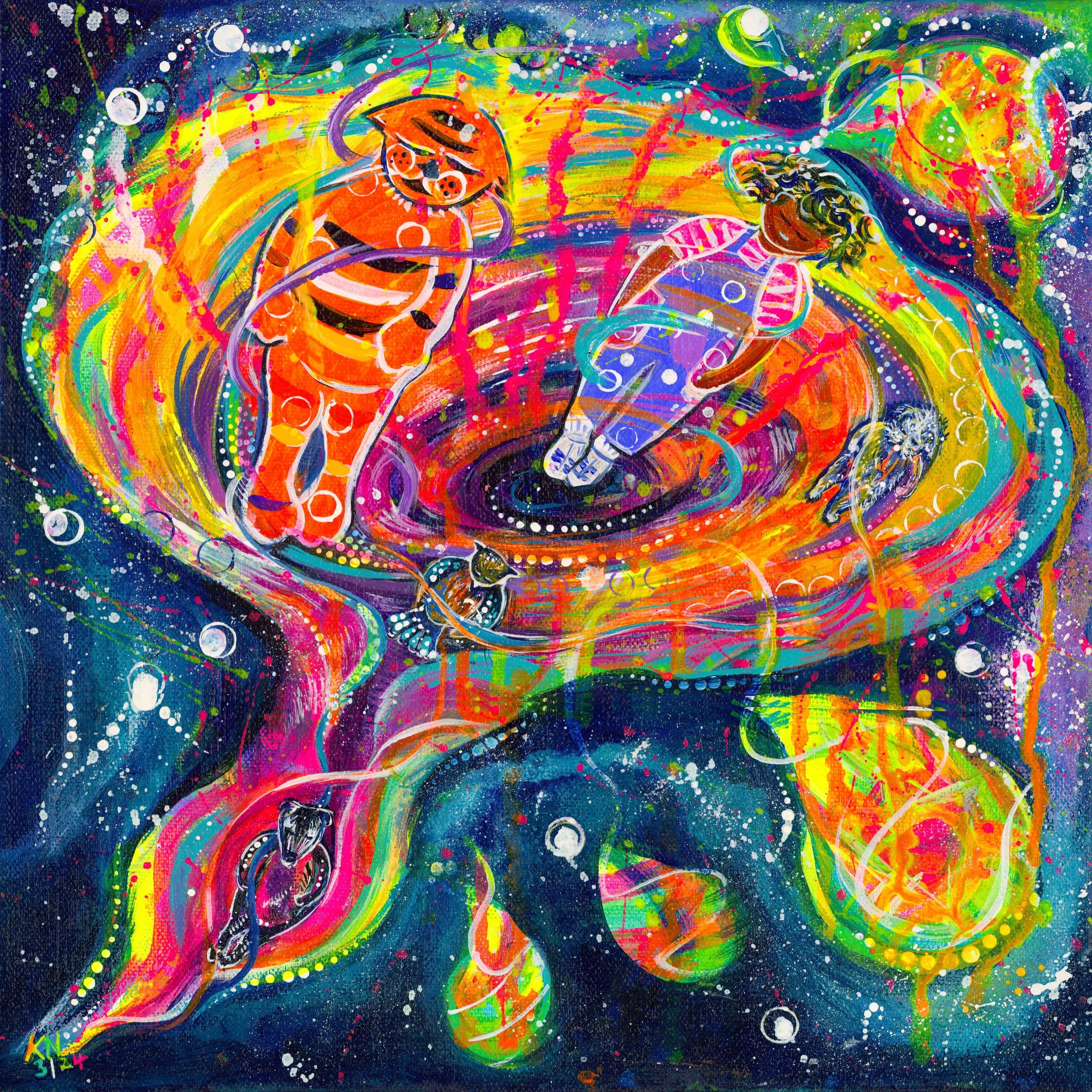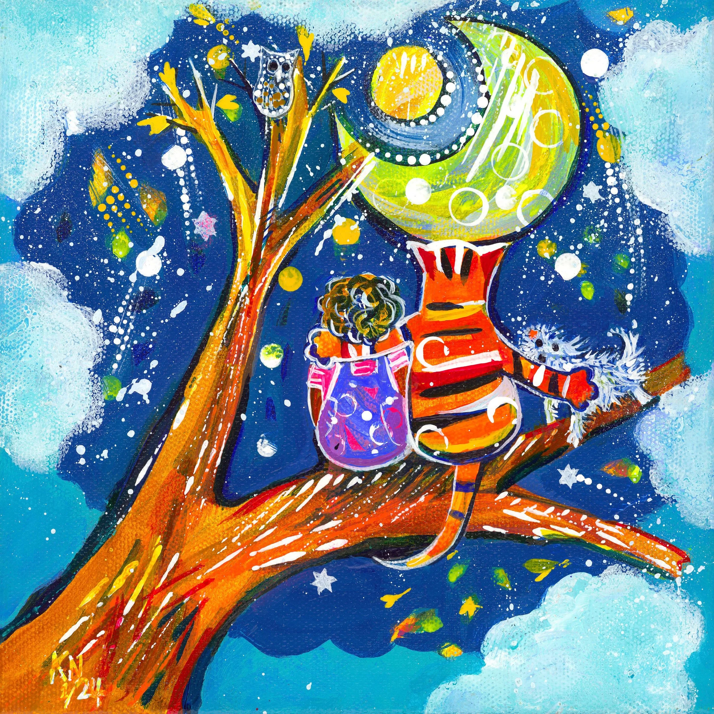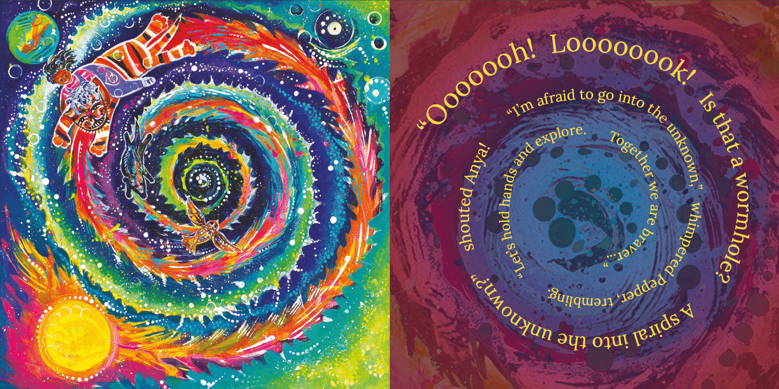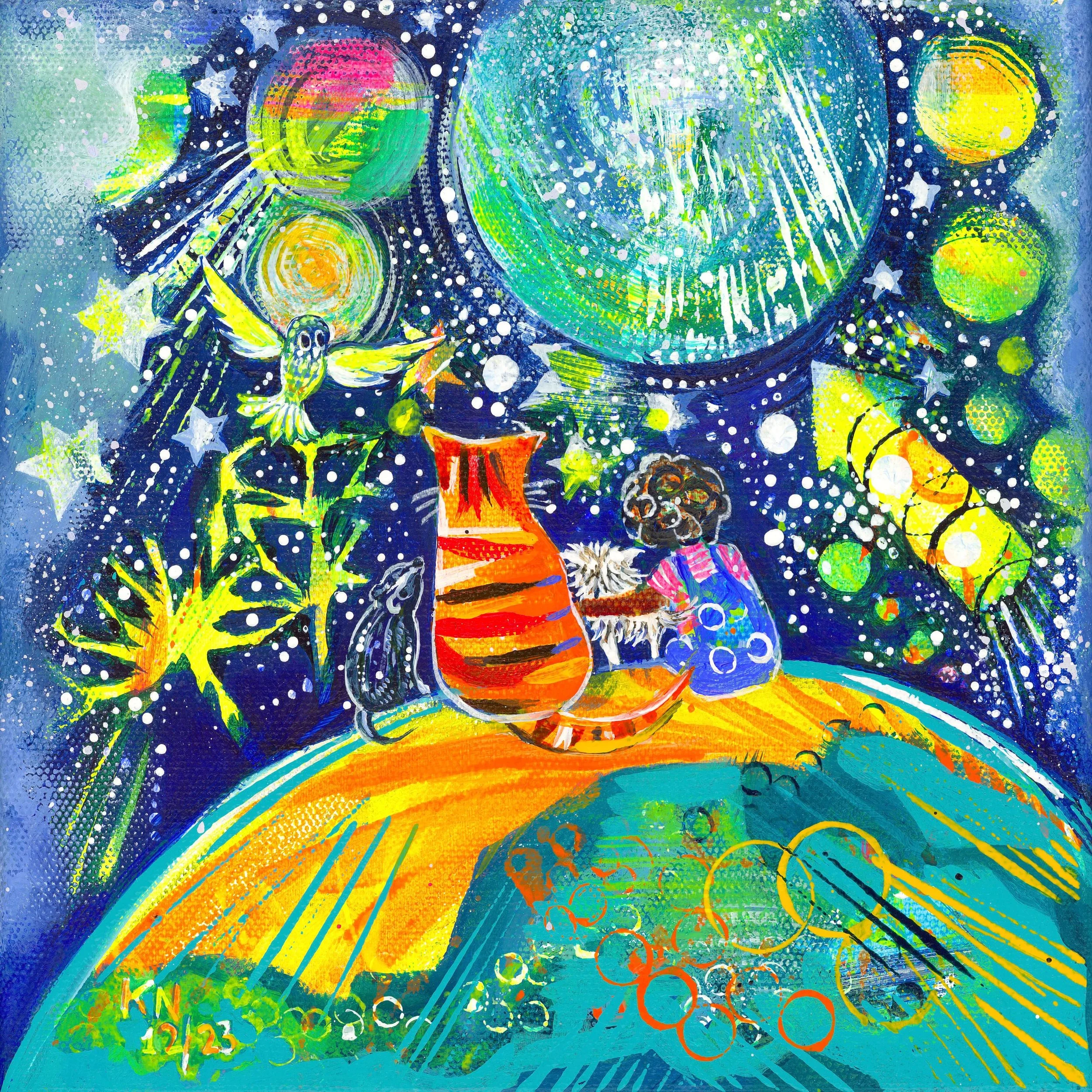 Kanj works in acrylics, slowly building layers with vibrant colours, pattern and mark-making, to create her exuberant and unique illustrations. Her children’s book, ‘Imagine If We Could Fly’, is inspired by her daughter Anya, who sets off on her imaginative adventures, making friends along the way. It is a colourful and artistic book about friendships, of accepting each other’s differences, of having the freedom to dream and be creative.