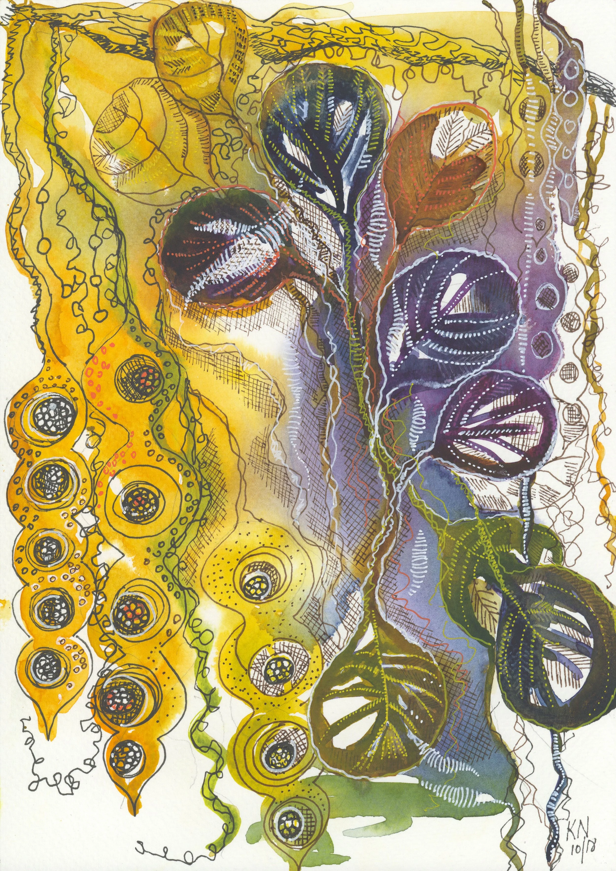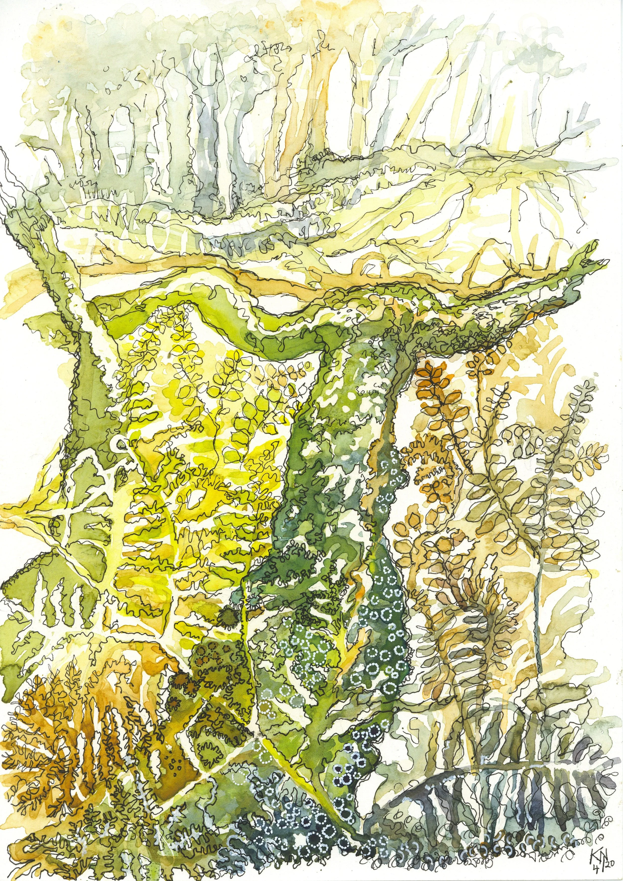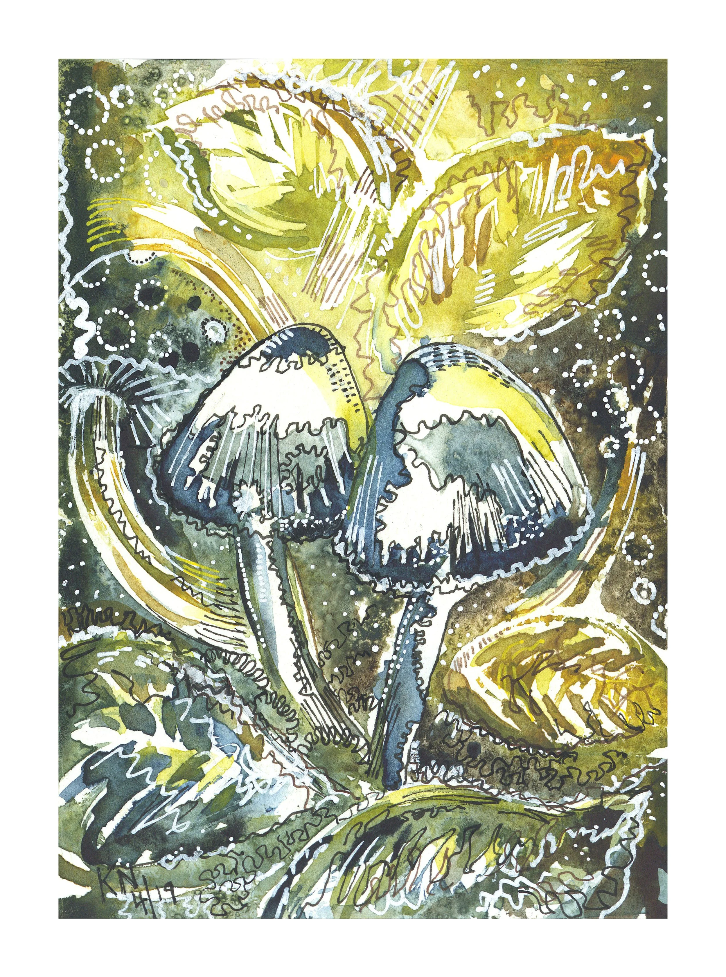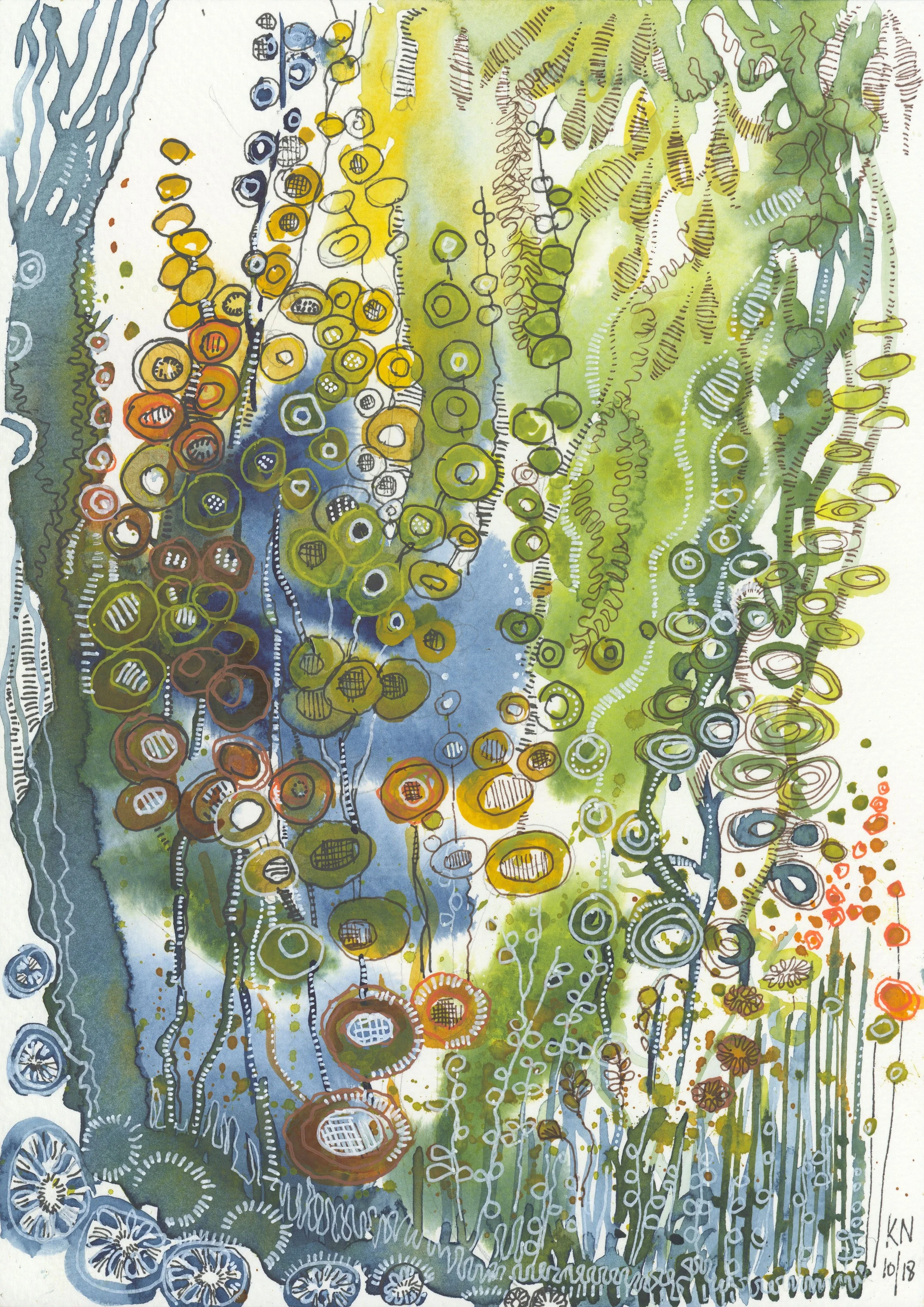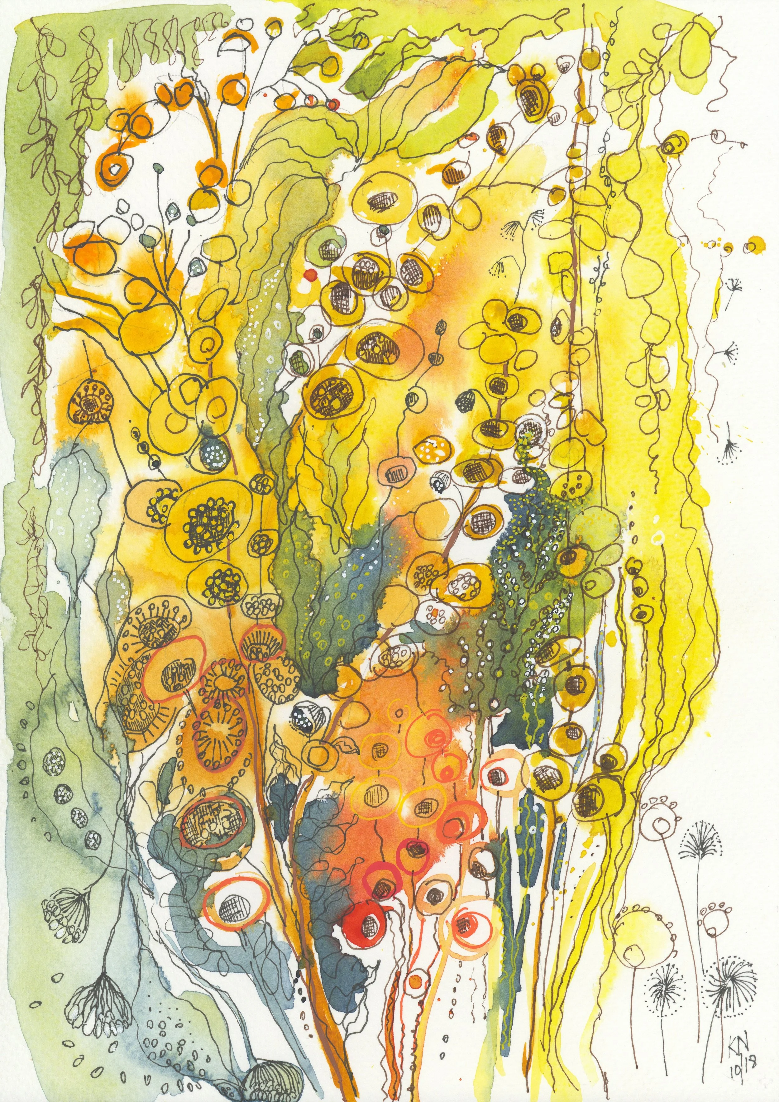 Kanj's watercolor works are deeply inspired by the natural world, serving as intuitive responses to her sensory experiences—what she sees, hears, and feels in the moment. Through fluid brushstrokes, she captures the essence of natural shapes and forms, with a particular focus on patterns within the landscape. Delicate details added with fine liner pens bring an additional layer of depth and vibrancy, infusing her paintings with life and texture.