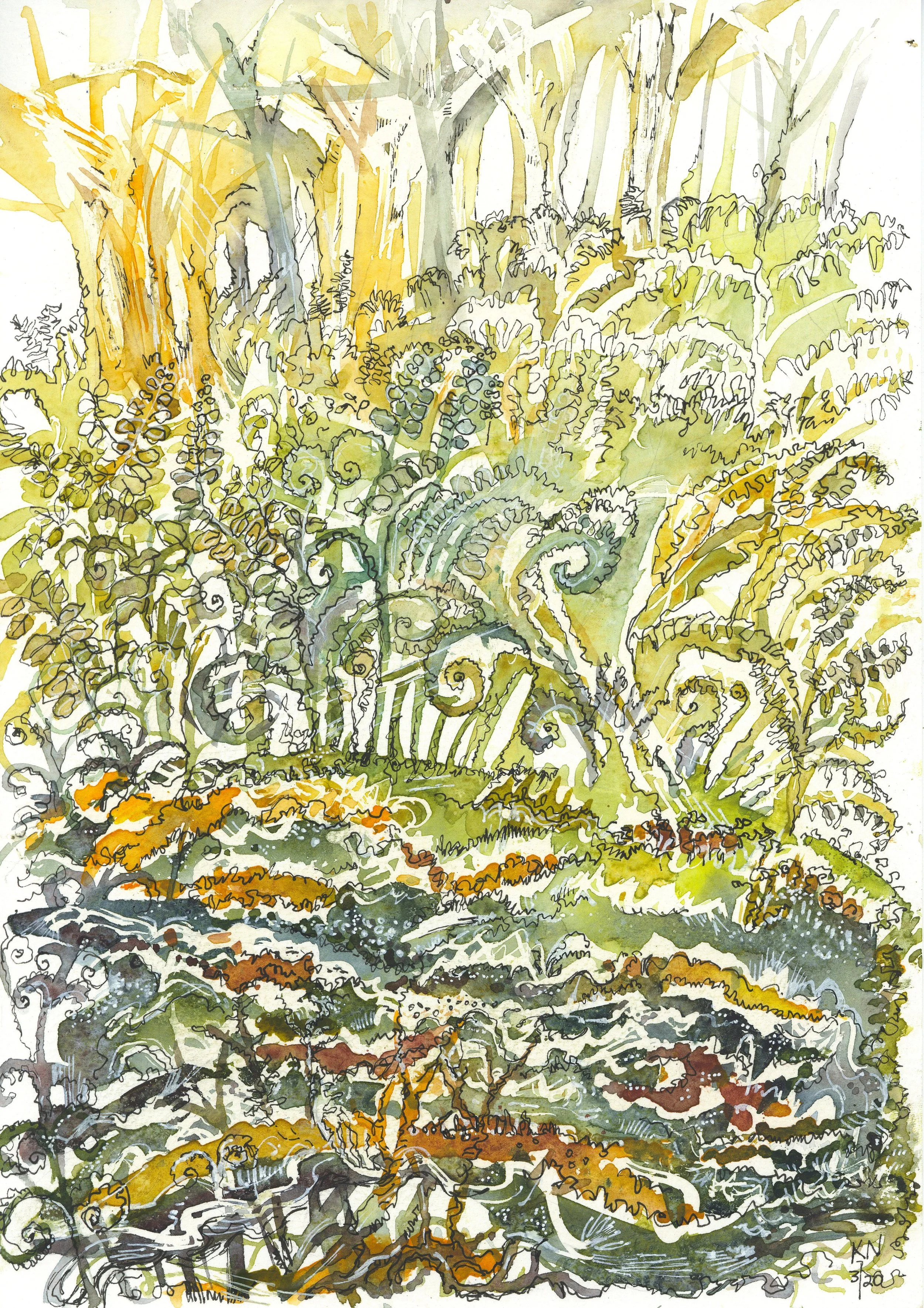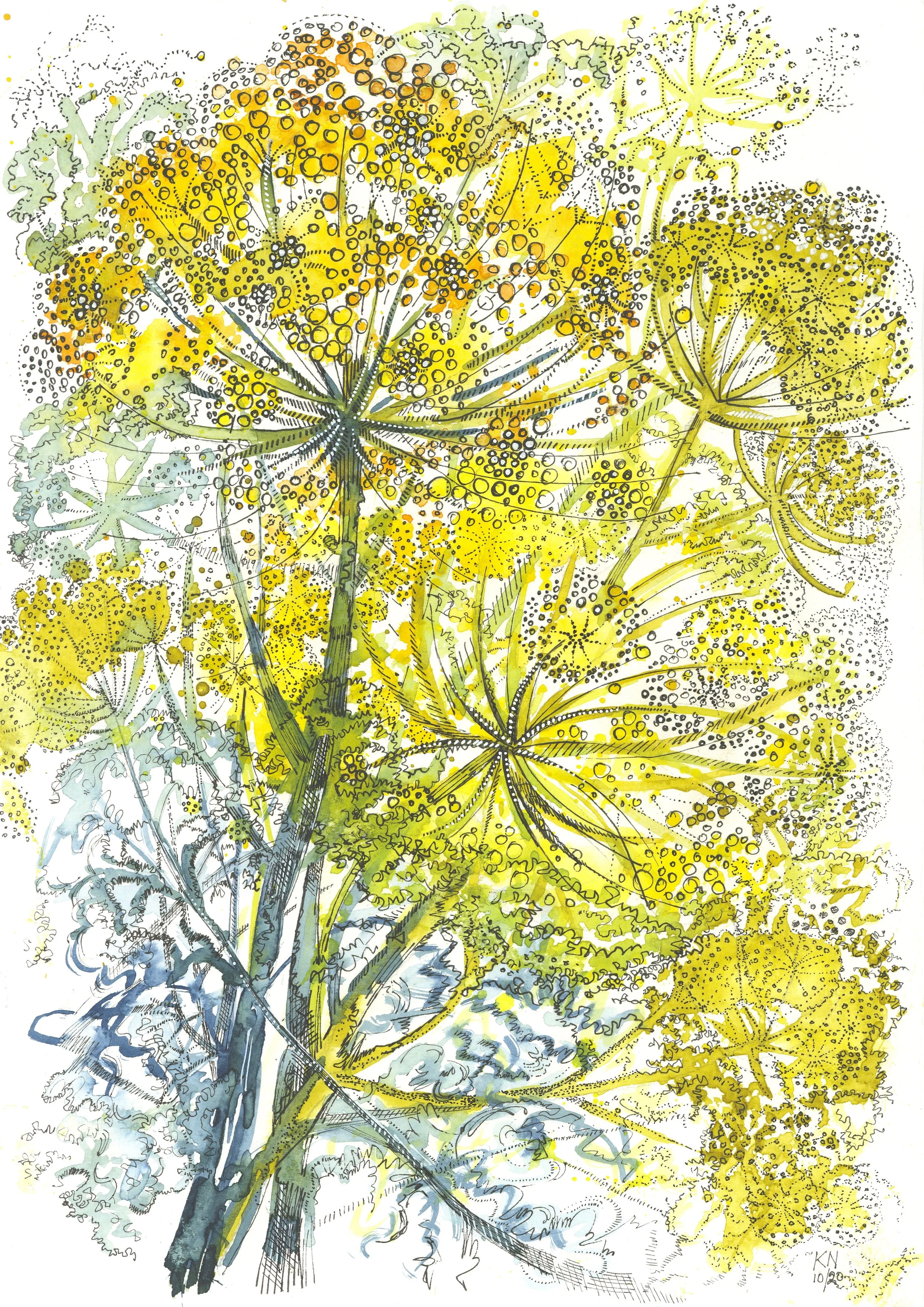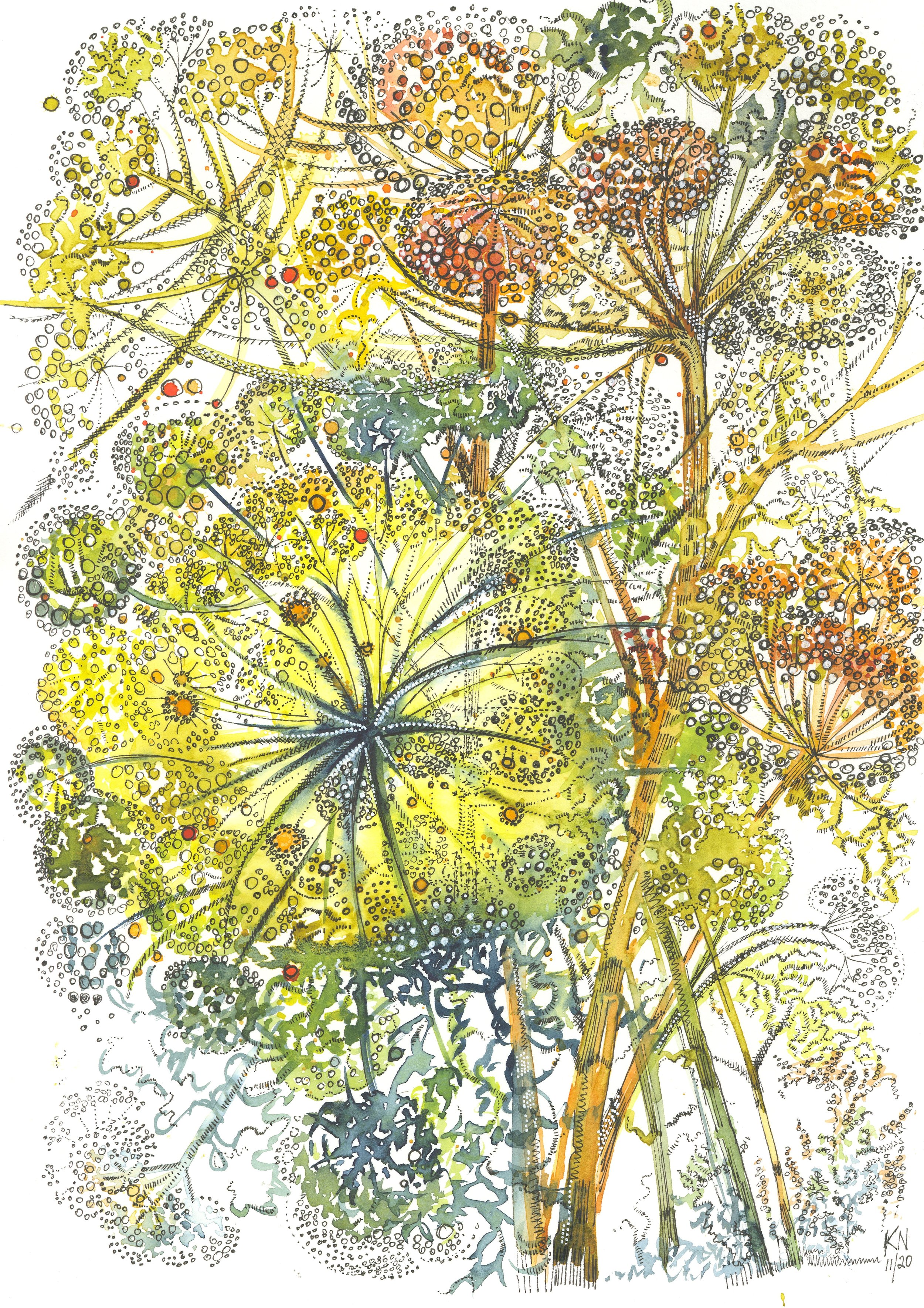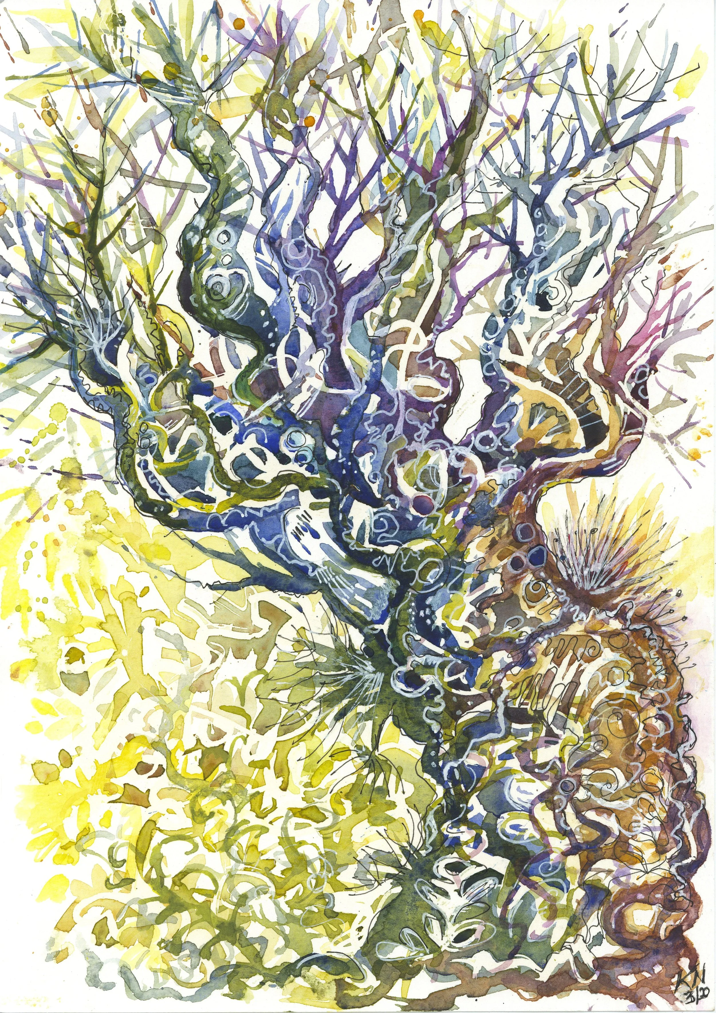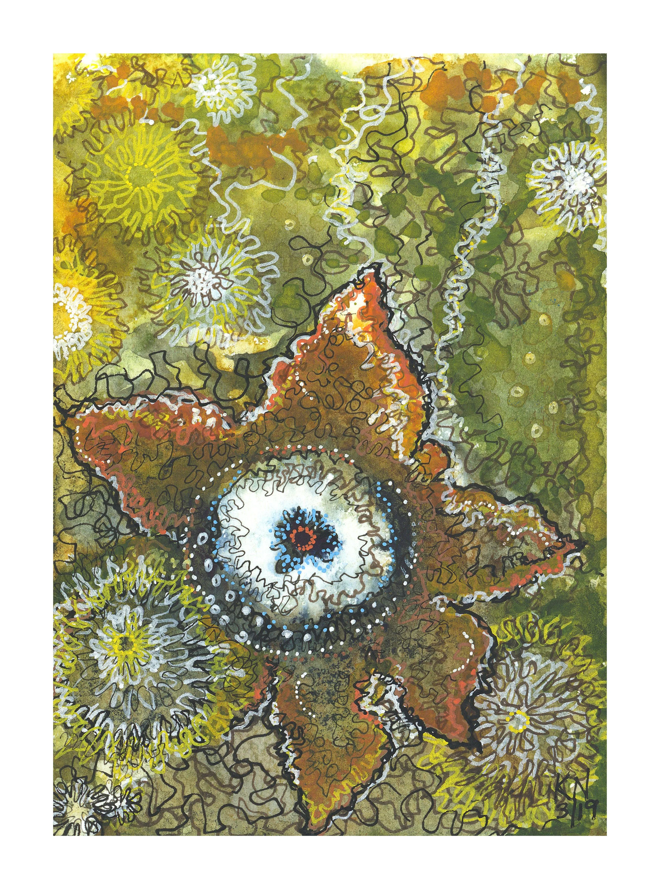 Kanj's watercolor works are deeply inspired by the natural world, serving as intuitive responses to her sensory experiences—what she sees, hears, and feels in the moment. Through fluid brushstrokes, she captures the essence of natural shapes and forms, with a particular focus on patterns within the landscape. Delicate details added with fine liner pens bring an additional layer of depth and vibrancy, infusing her paintings with life and texture.