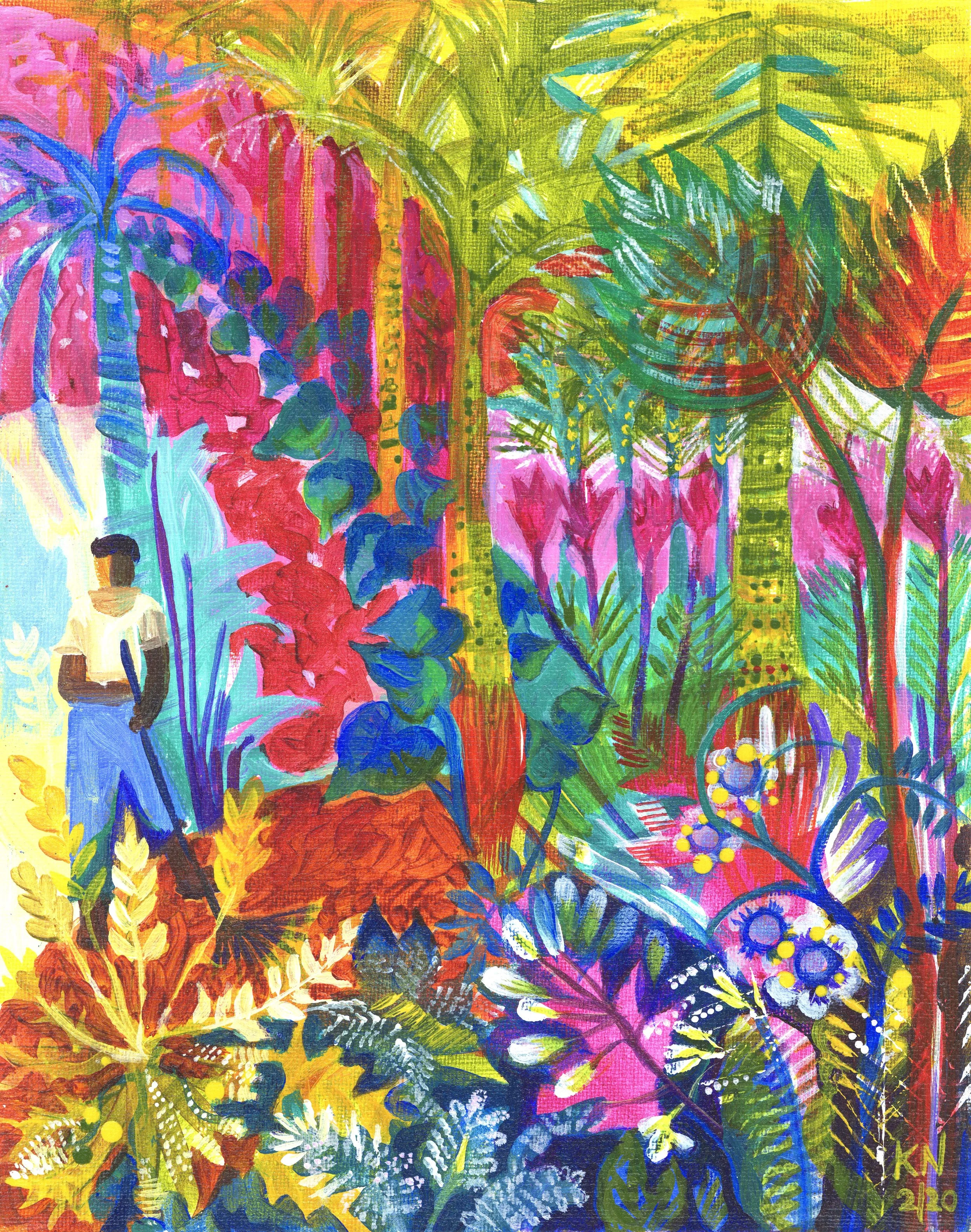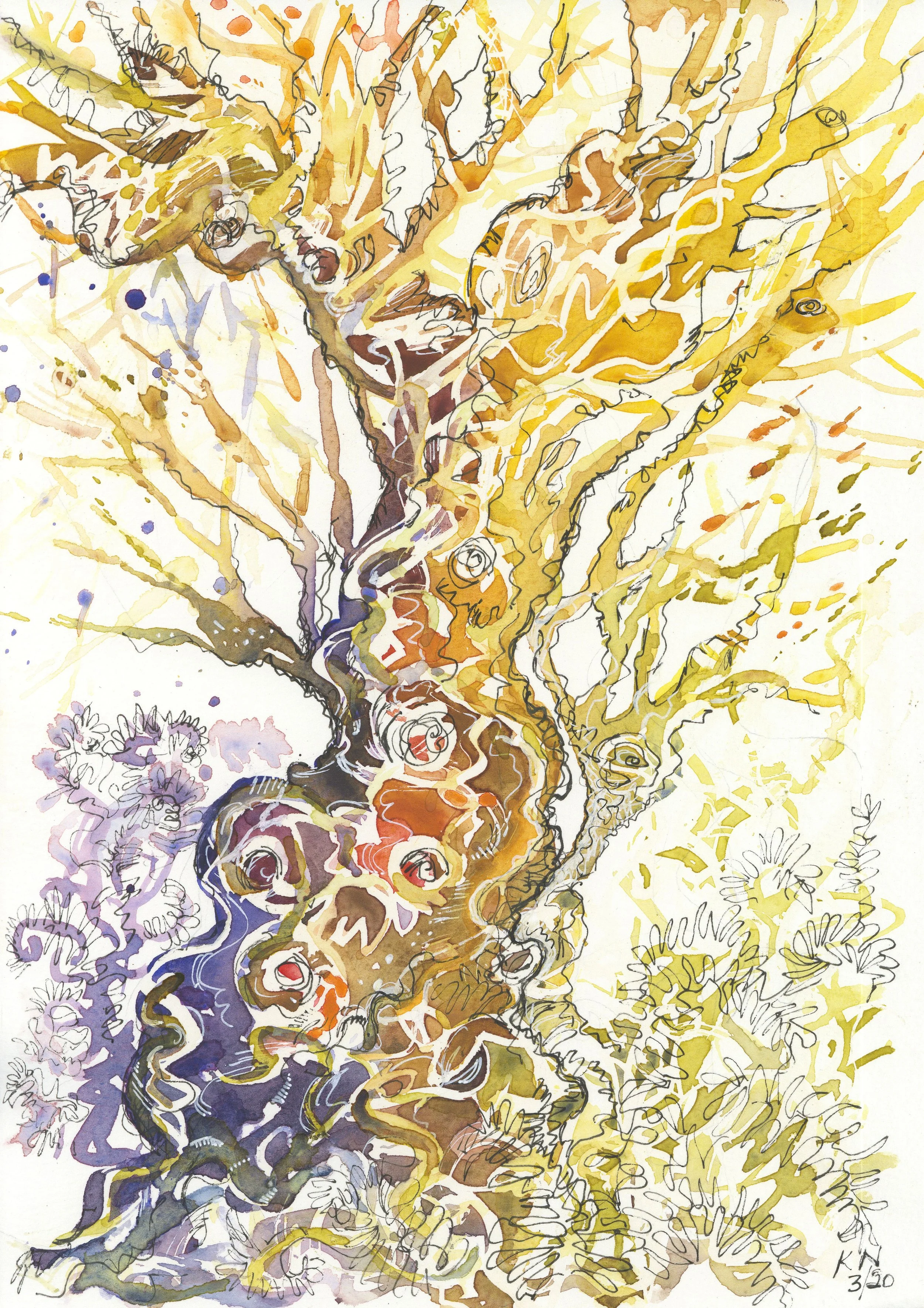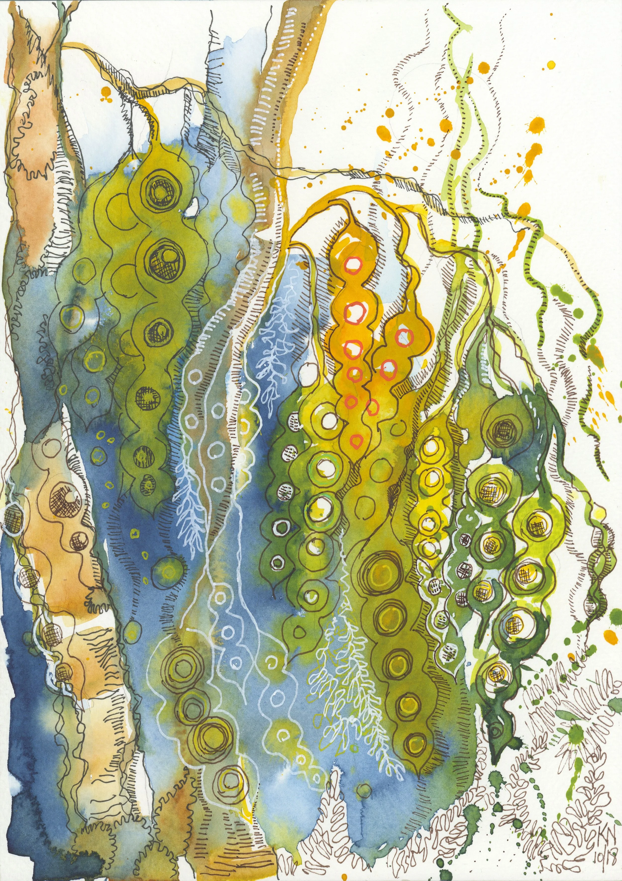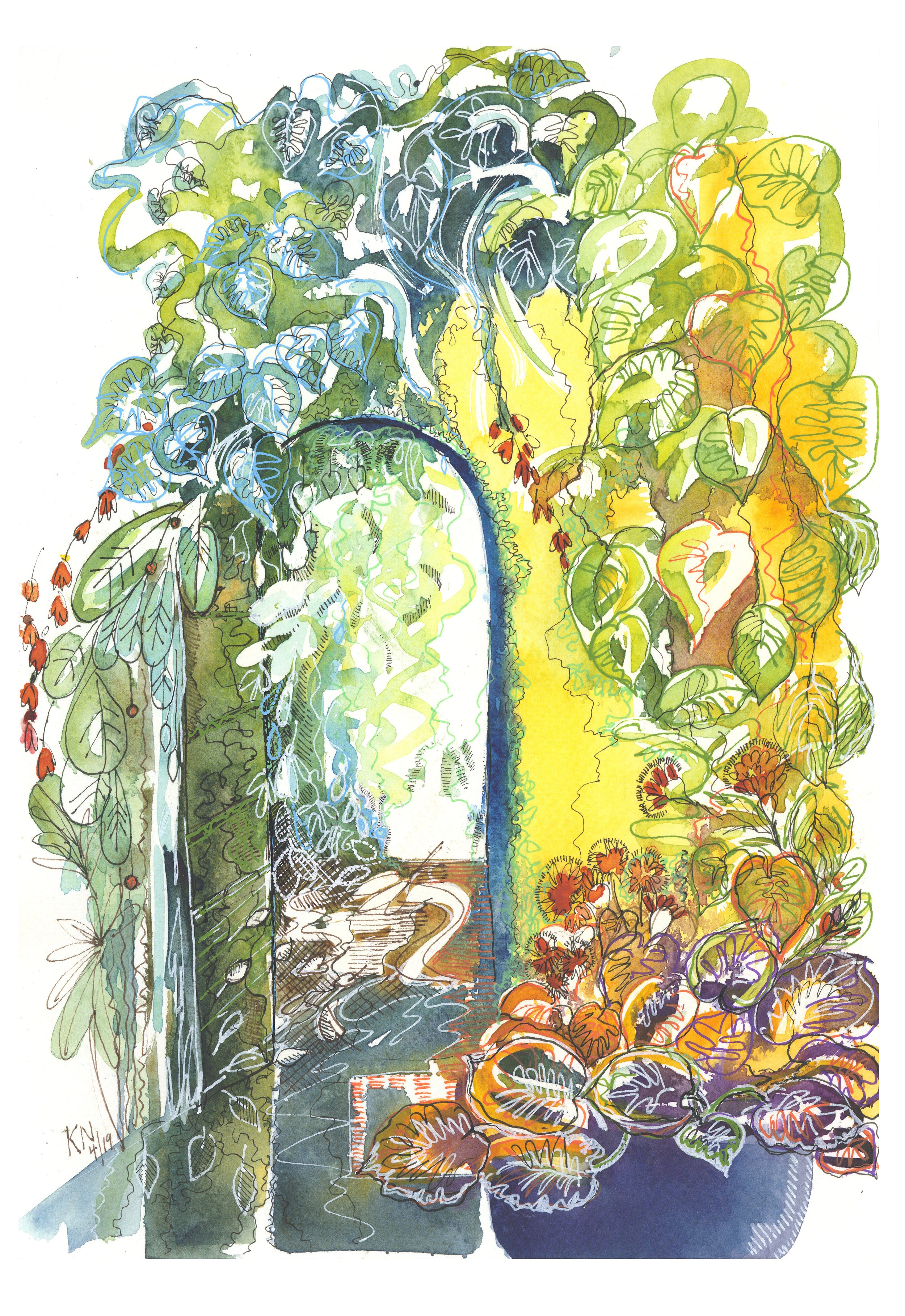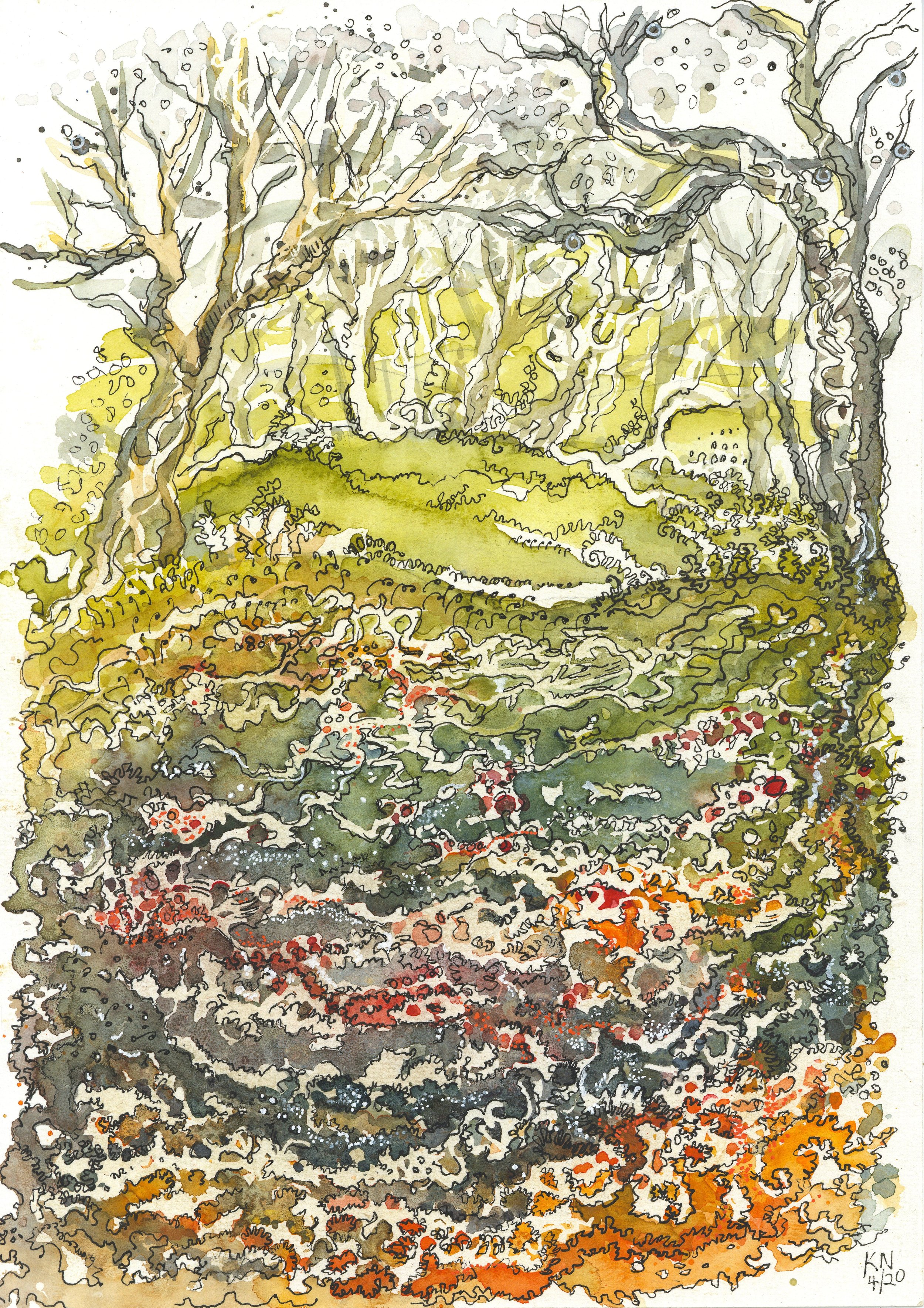 Kanj's watercolor works are deeply inspired by the natural world, serving as intuitive responses to her sensory experiences—what she sees, hears, and feels in the moment. Through fluid brushstrokes, she captures the essence of natural shapes and forms, with a particular focus on patterns within the landscape. Delicate details added with fine liner pens bring an additional layer of depth and vibrancy, infusing her paintings with life and texture.