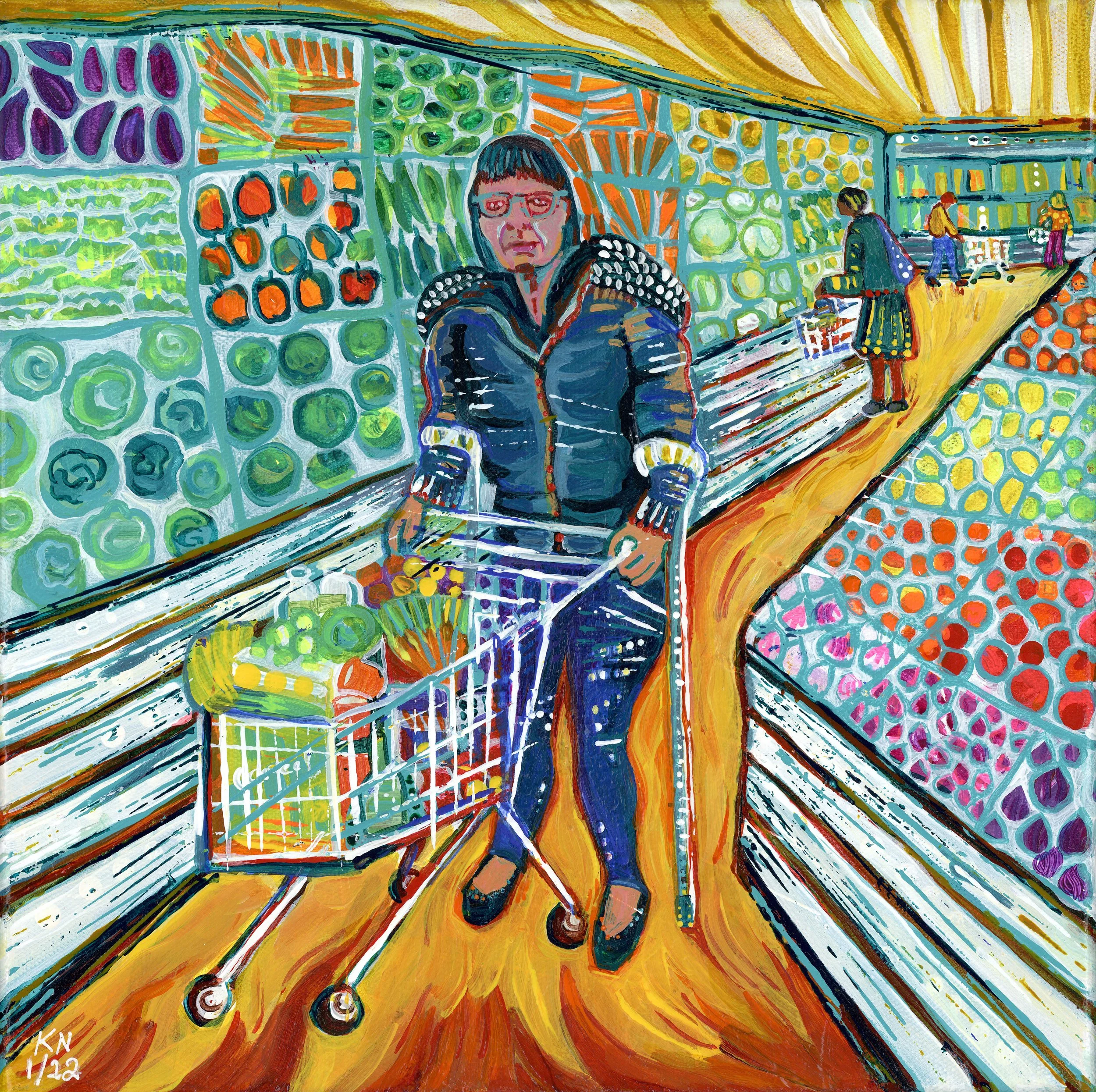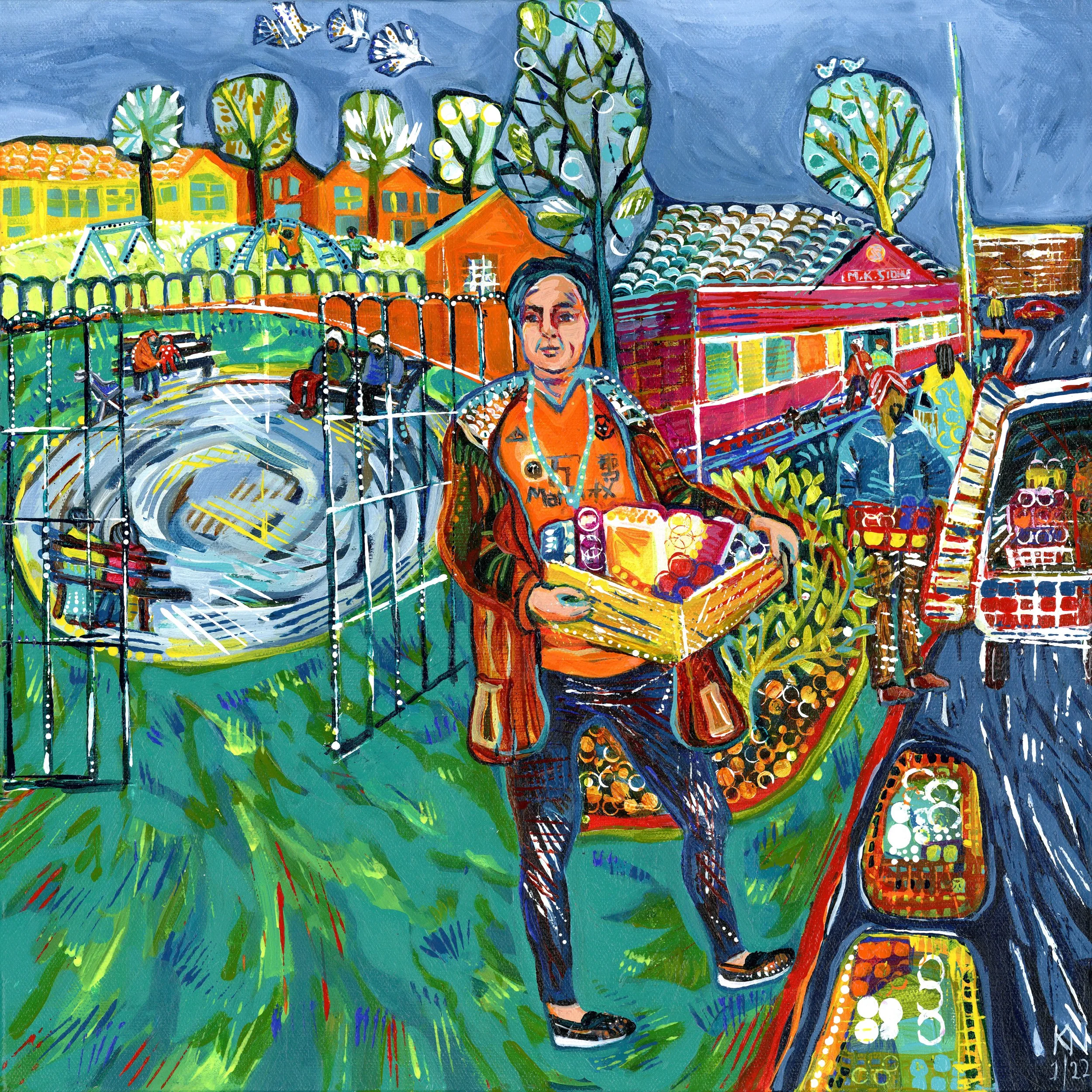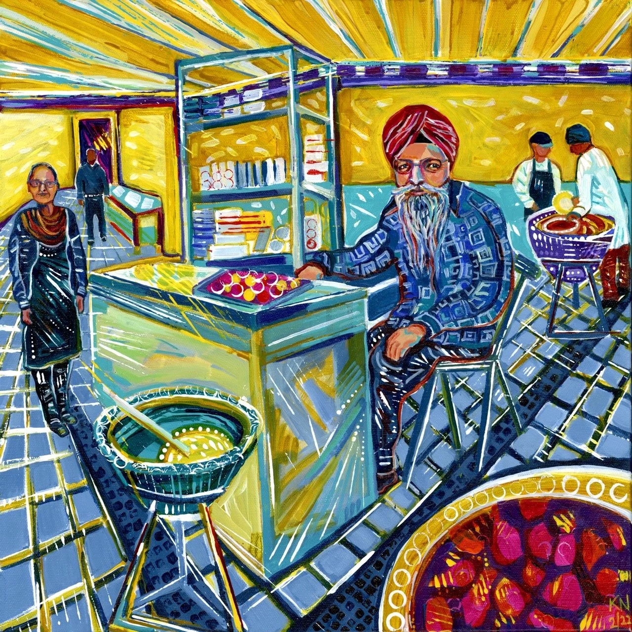 Kanj's acrylic paintings are characterised by a bold use of colour and intricate patterns, reflecting her passion for vibrancy and dynamic expression. Her work delves into the interactions between people and places, uncovering narratives embedded within communities. Through a methodical process of layering color, mark-making, and pattern, she creates compositions that evolve gradually, emphasizing the joy of creation over the final outcome.
